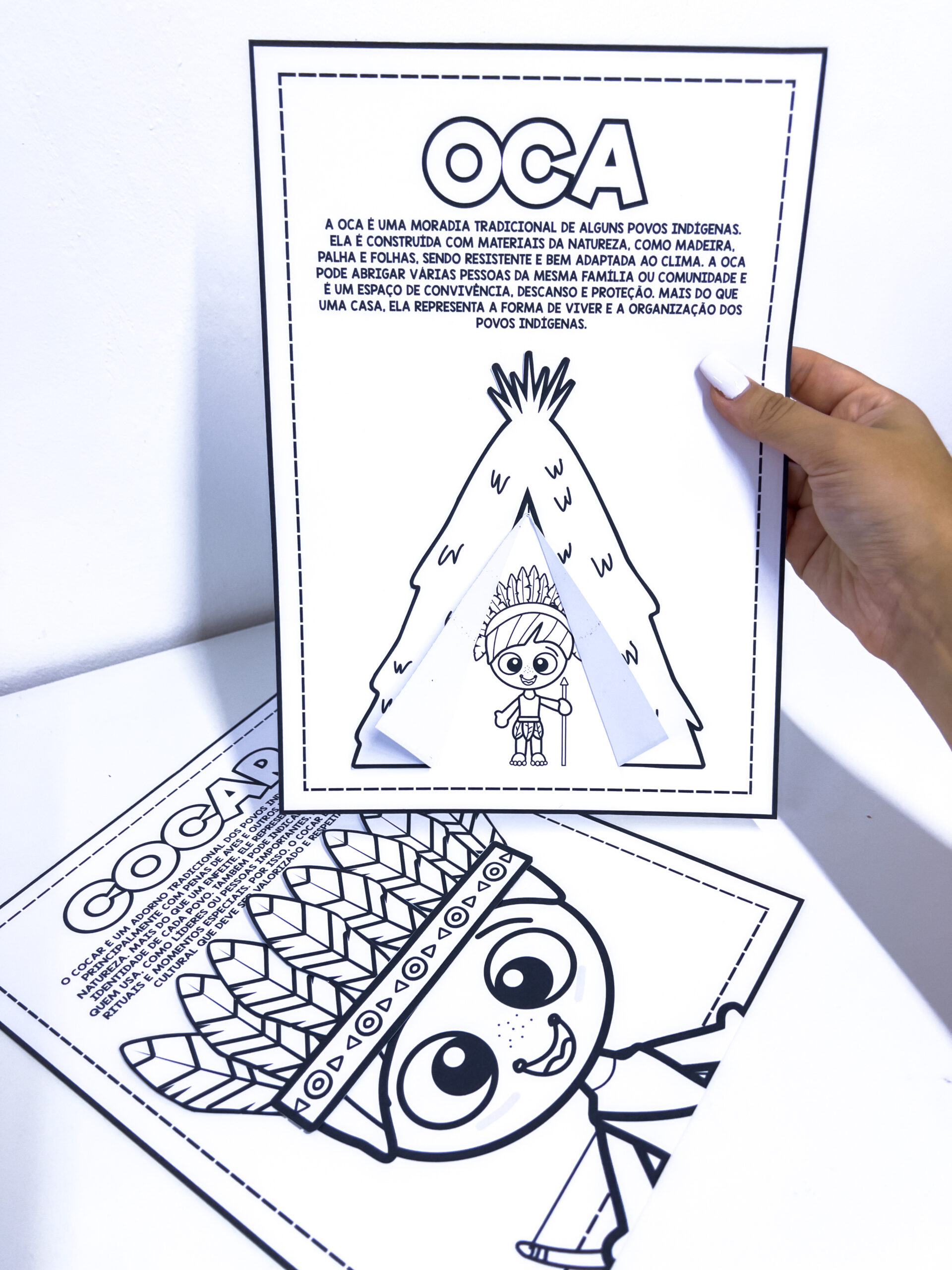 - Atividade da oca: apresenta uma explicação simples sobre a oca, acompanhada de uma proposta interativa para colorir e montar.