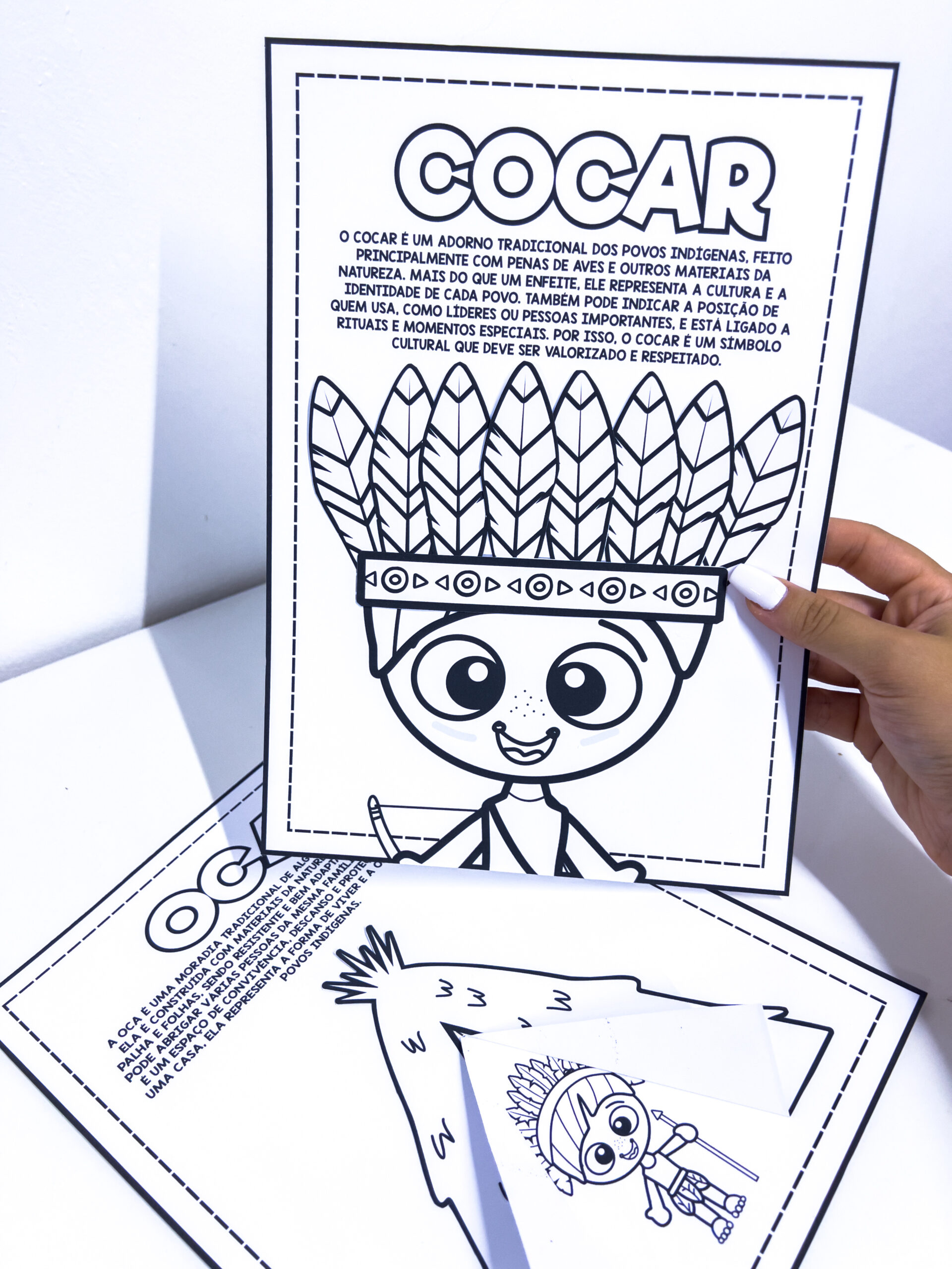 - Atividade do cocar: contém uma breve explicação e uma ilustração para colorir, onde as crianças recortam e colam as penas no personagem, montando o cocar.