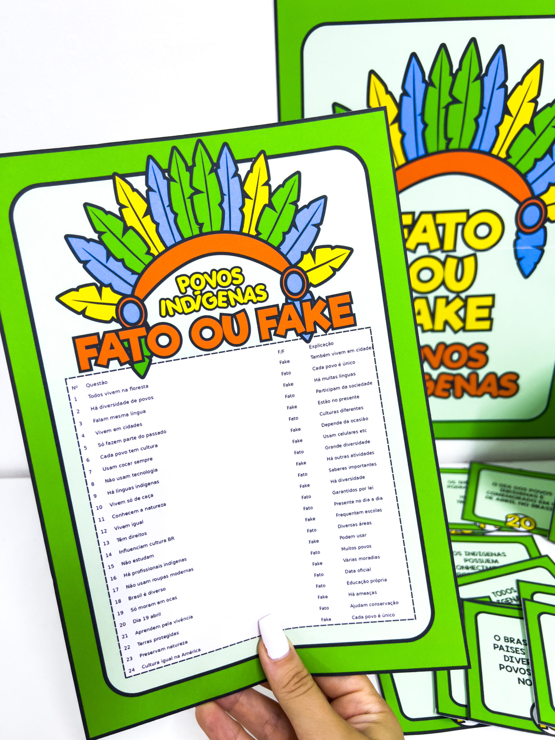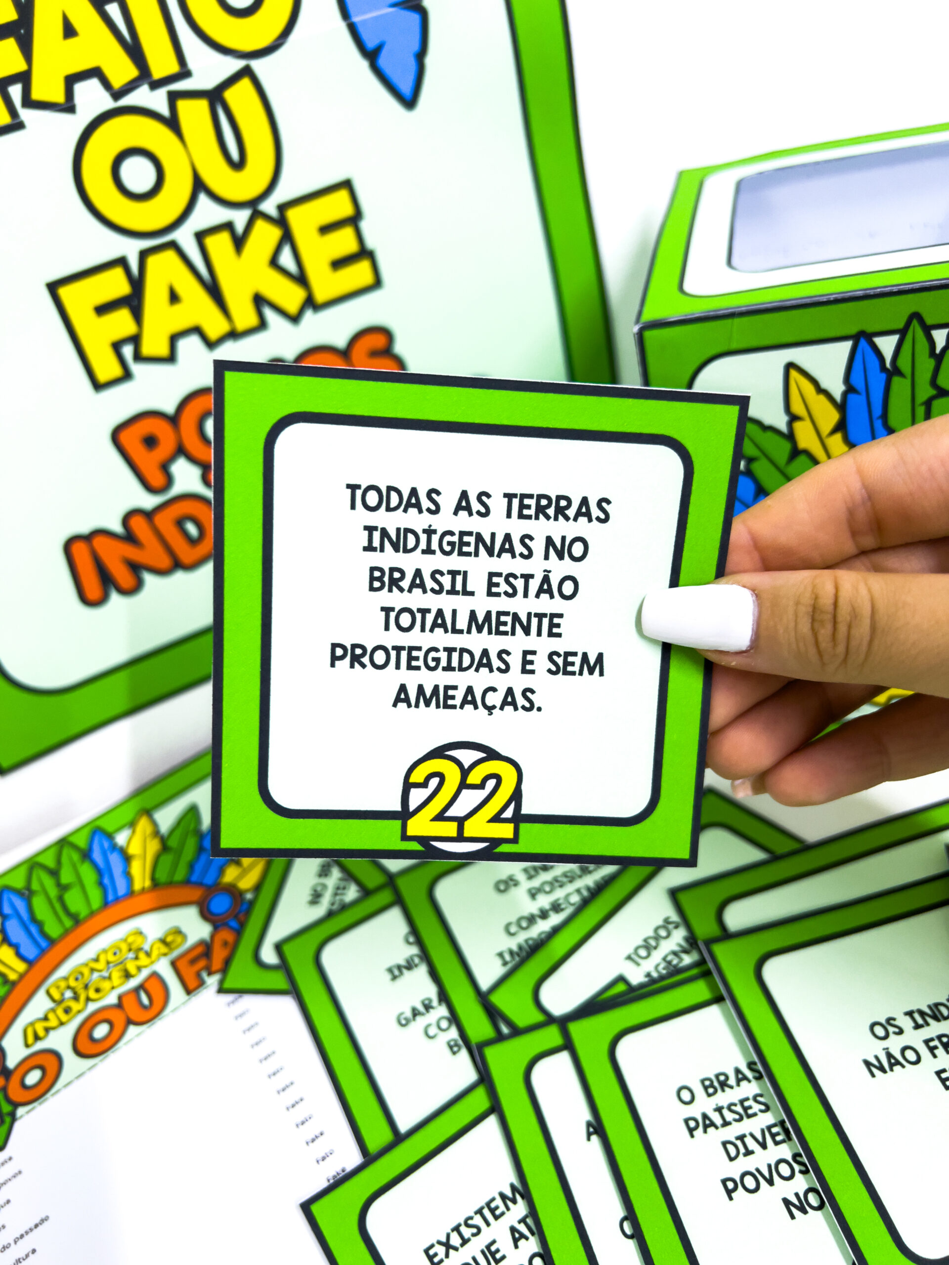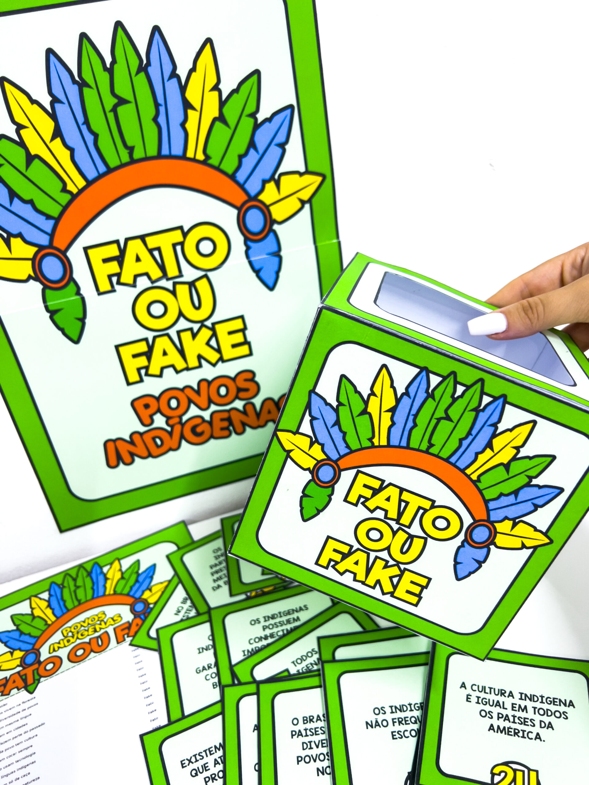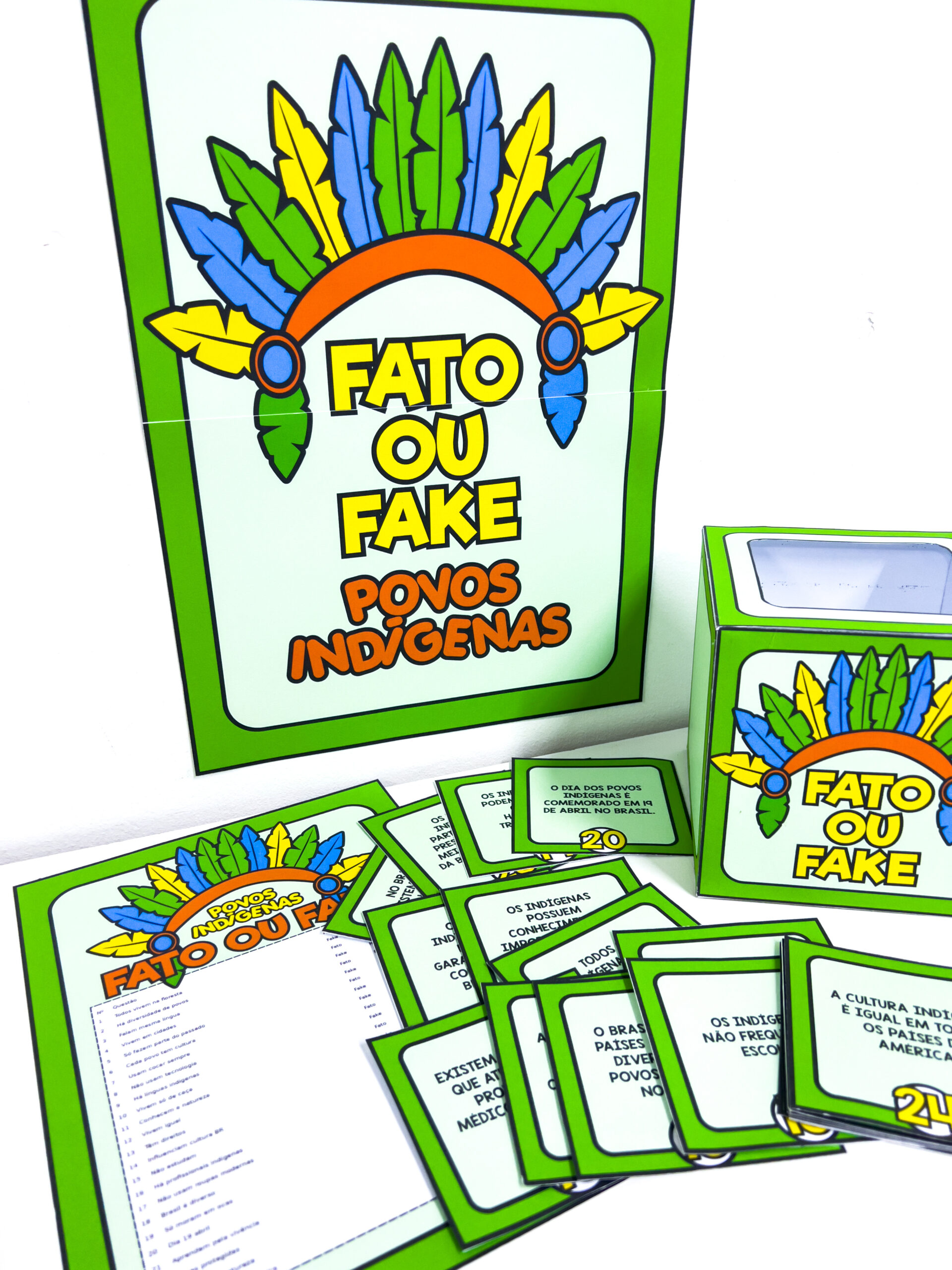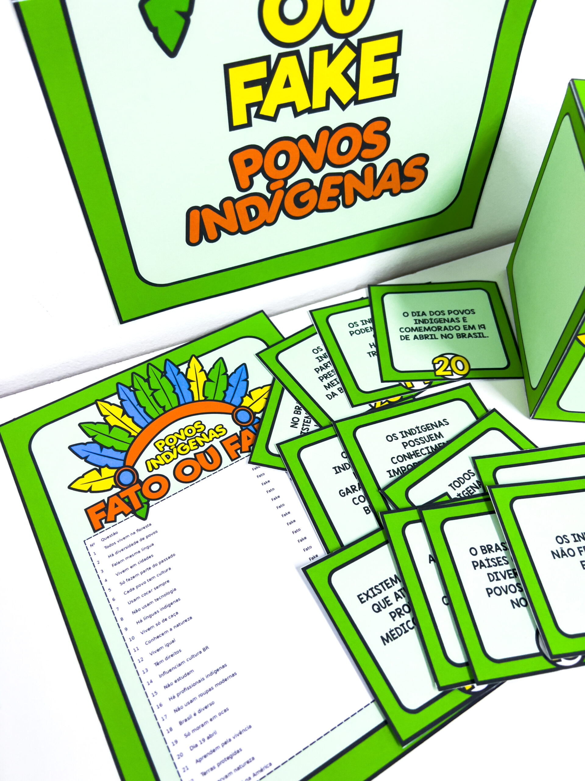 Fato ou Fake: Dia dos Povos Indígenas Proposta lúdica e reflexiva para trabalhar o Dia dos Povos Indígenas (19 de abril), estimula o pensamento crítico e a participação dos alunos e ajuda a diferenciar informações verdadeiras de ideias equivocadas. Composição do material: * Cartaz em duas folhas para montagem de painel * Molde de caixinha para organizar as fichas * 24 fichas com perguntas diferentes (Fato ou Fake) * Gabarito completo para apoio do professor Indicado para dinâmicas em grupo, rodas de conversa e atividades interativas em sala de aula.