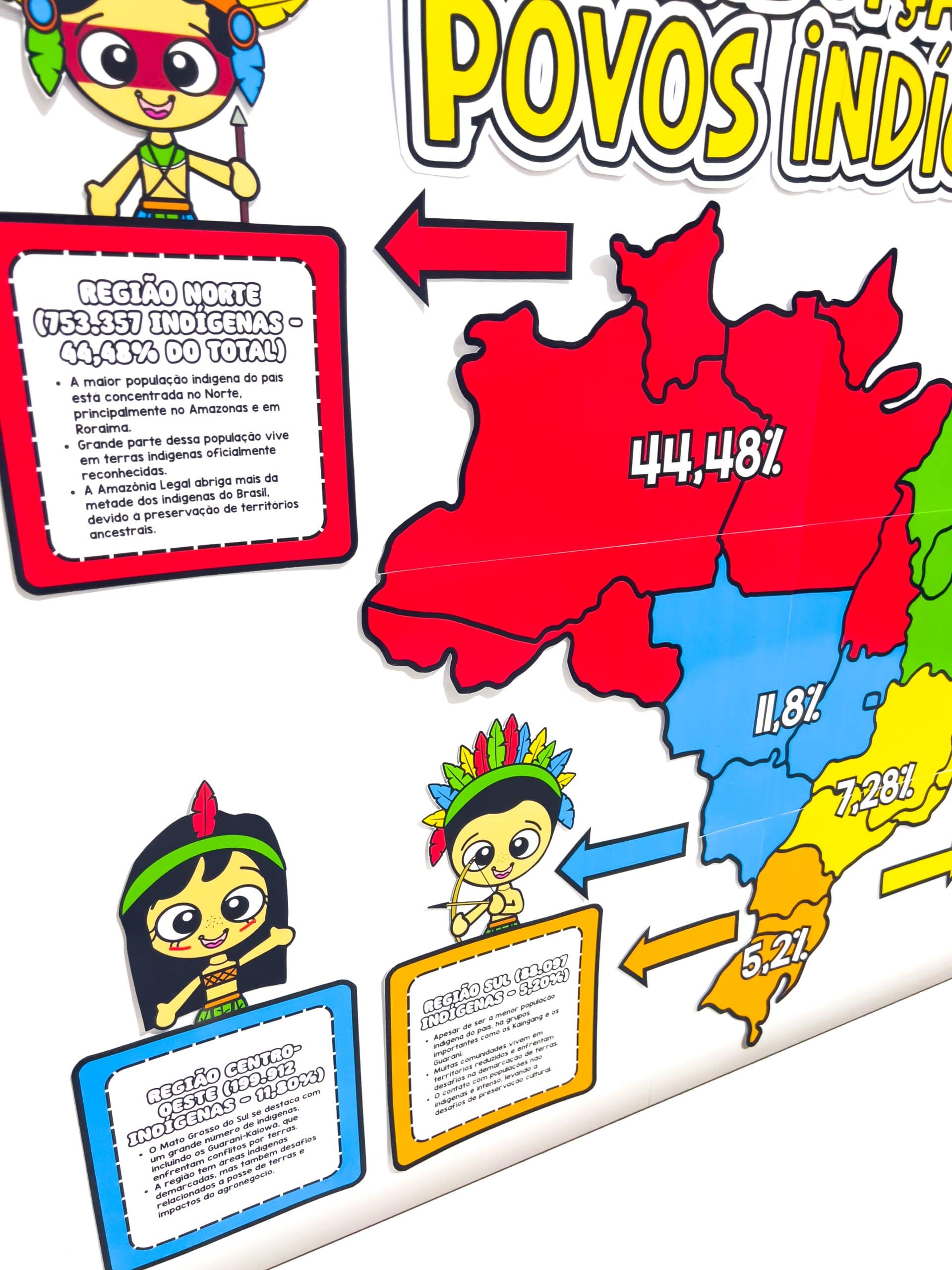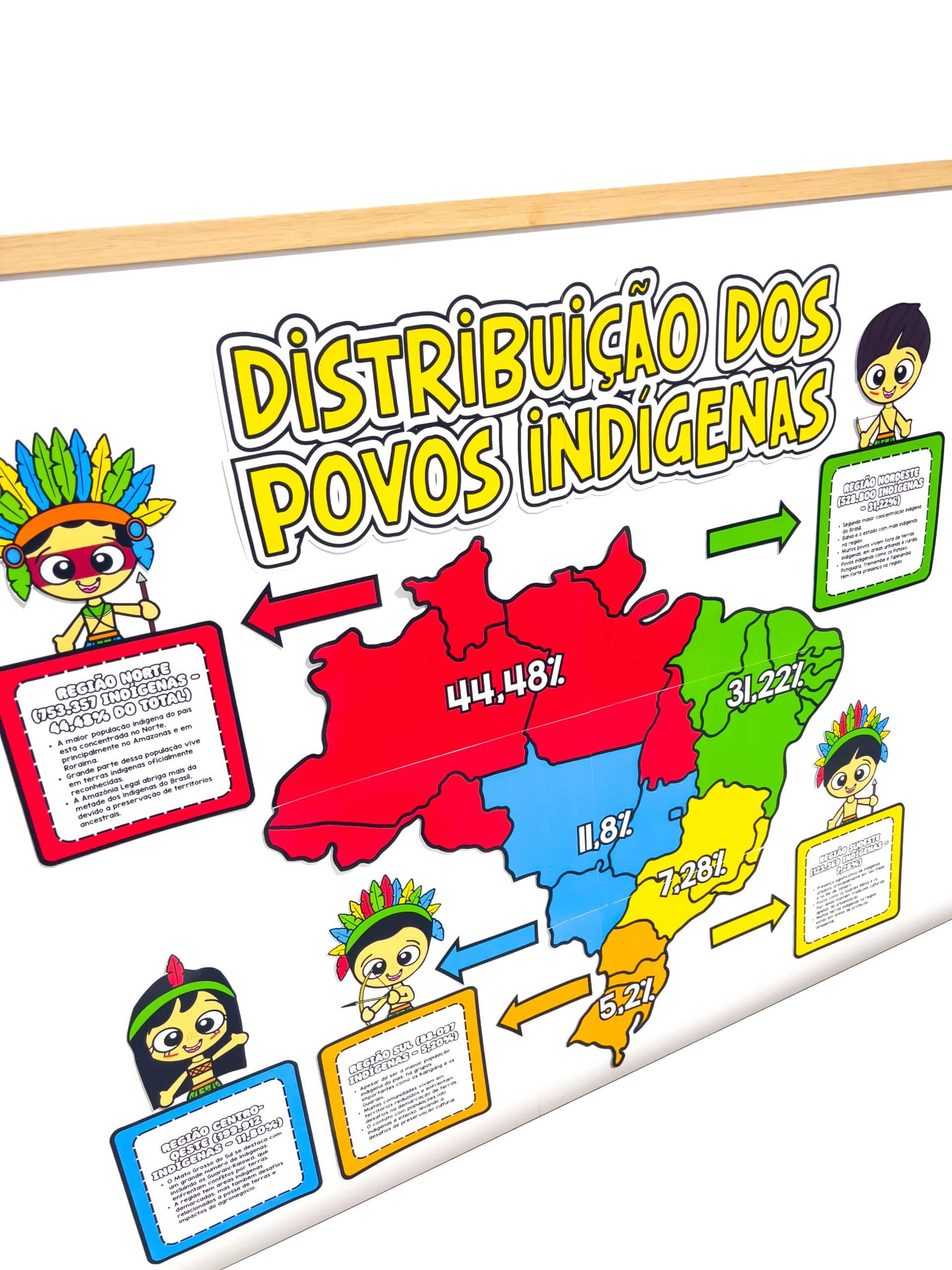 ⭐Este painel educativo apresenta a distribuição dos povos indígenas no Brasil por meio de um mapa colorido com porcentagens para cada região. ⭐Além disso, traz breves descrições sobre os indígenas de cada área, destacando aspectos culturais e históricos. ⭐Ilustrações de personagens indígenas tornam o material atrativo para crianças, facilitando o aprendizado de forma visual e interativa. ⭐Ideal para aulas de História e Geografia, o painel promove a valorização da diversidade indígena e sua preservação.